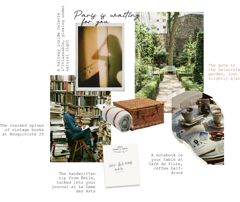 At check-in, you’ll receive a 35mm analog-style camera to document your journey. Use the preconfigured filter of La Dame des Arts with a signature grain and colorimetry. We call this: Frames of Paris.